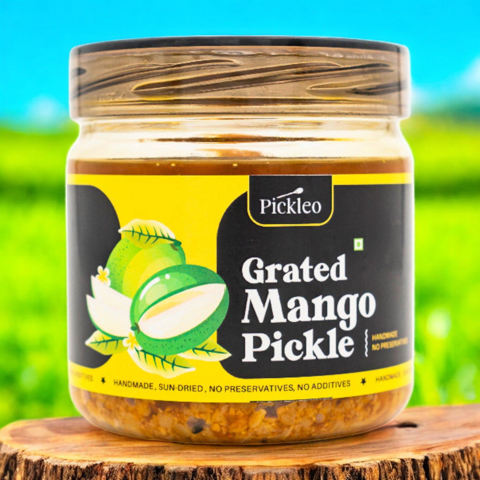 Elevate your meals with our Grated Mango Pickle, a vibrant and tangy condiment made from sun-ripened mangoes, finely grated to capture their juicy essence. Infused with a blend of aromatic spices and a touch of sweetness, this artisanal pickle delivers a burst of bold flavor that perfectly complements curries, dal chawal, parathas and sandwiches. Conveniently packaged in a resealable jar to maintain freshness, our Grated Mango Pickle adds a delightful, exotic twist to any dish, making it a must-have for those who love to infuse their meals with a touch of tradition and zest.